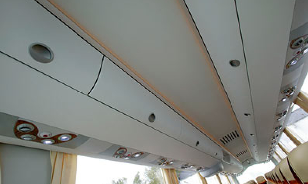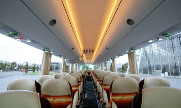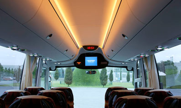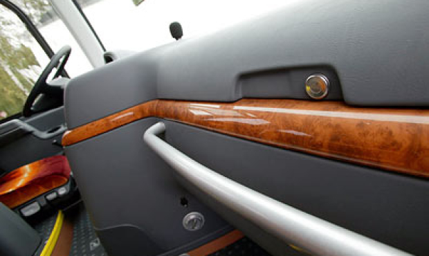: Habitacle spacieux, kitchenette, écran plat intégré, appliques en bois sur les sièges, climatisation, tablettes rabattables, accessoires d’ambiance au-dessus de chaque siège avec éclairage à LED, buses d’aération, haut-parleurs et touche d’appel, racks à bagages fermés et spacieux, éclairage de nuit indirect, poste de conduite ergonomique, grand coffre côté accompagnateur